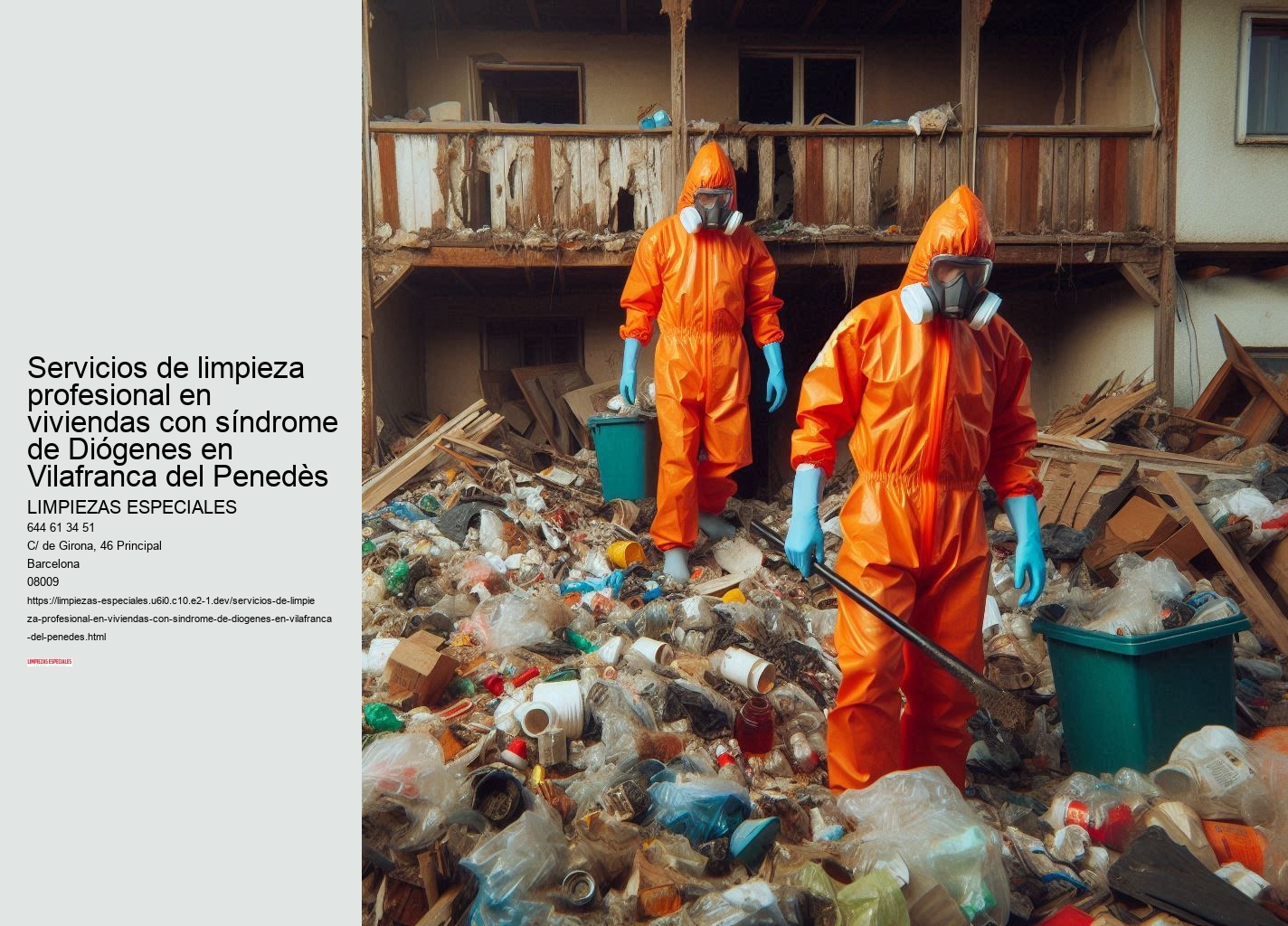 ¿Por qué esperar más? Póngase en contacto con nosotros hoy mismo y recupere la tranquilidad y seguridad de su hogar. Llame ahora para recibir un presupuesto gratuito y sin compromiso. Mejor opción para la Servicios de limpieza profesional en viviendas con síndrome de Diógenes en Vilafranca del Penedès !LLAMA AHORA¡ No enfrente este desafío solo, estamos aquí para asistirle en cada paso del camino. ¡Transforme su hogar y su vida con Limpiezas Especiales!